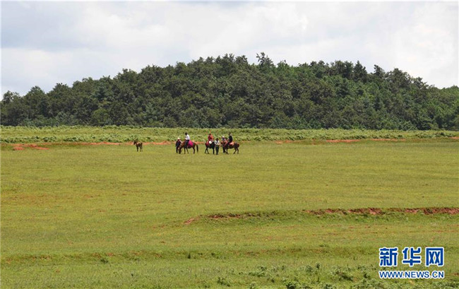 8月10日,游人在云南尋甸北大營草場騎馬。 新華社記者楊宗友攝