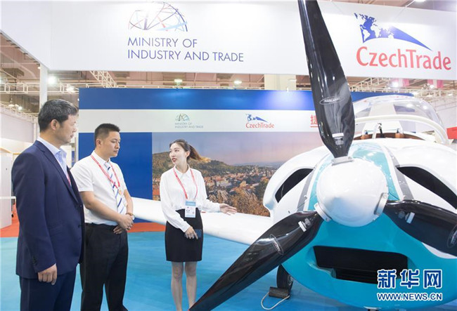 6月8日,在浙江寧波舉行的首屆中國-中東歐國家博覽會(huì)上,一名展商(右)在介紹捷克生產(chǎn)的一款輕型飛機(jī)。新華社記者 翁忻旸 攝