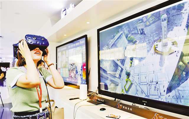 8月15日,在中國電信重慶公司,體驗(yàn)者頭戴VR設(shè)備,觀看解放碑的實(shí)時(shí)全景。在未來,5GVR將會(huì)在智慧旅游、遠(yuǎn)程教育、遠(yuǎn)程會(huì)議等多領(lǐng)域應(yīng)用。(本組圖片均由記者張錦輝攝)