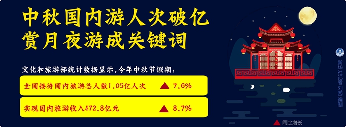 文化和旅游部統(tǒng)計數(shù)據(jù)顯示,今年中秋節(jié)假期,全國接待國內(nèi)旅游總人數(shù)1.05億人次,同比增長7.6%;實現(xiàn)國內(nèi)旅游收入472.8億元,同比增長8.7%。