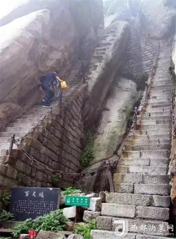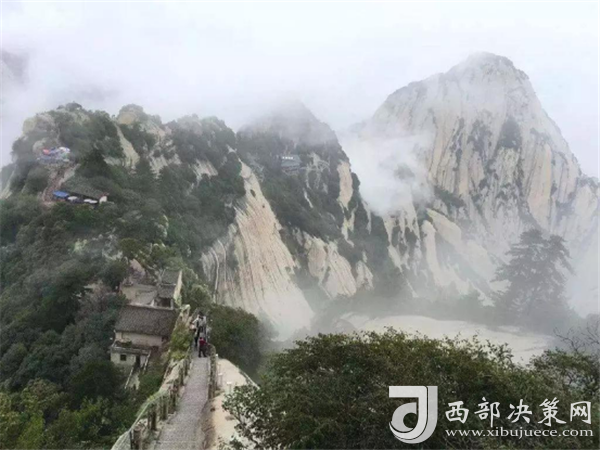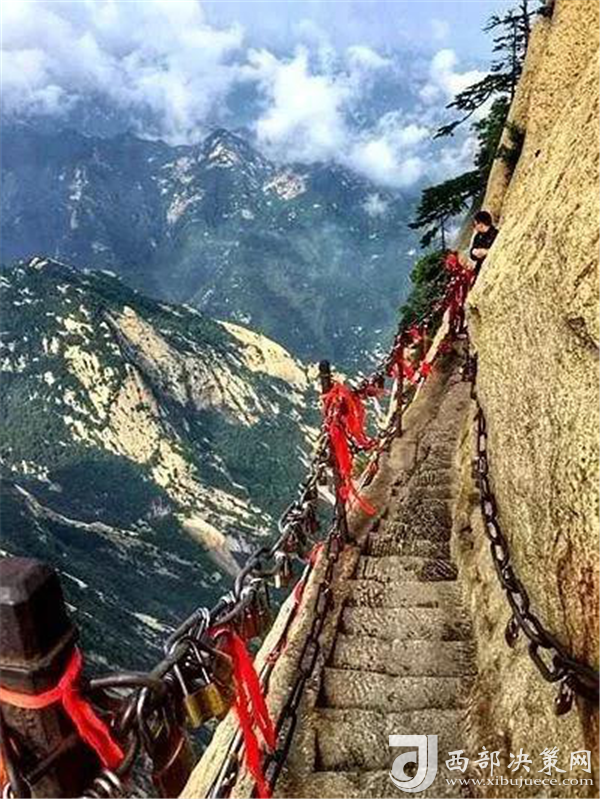 眾所周知,華山在五岳之中以“險(xiǎn)峻”著稱。素有“奇險(xiǎn)天下第一山”之譽(yù),華山的主體是由一塊完整碩大的花崗巖體構(gòu)成的,挺拔地屹立在渭河平原。東、南、西三峰拔地而起,如利刃削就。由于華山太險(xiǎn),所以唐代以前很少有人登臨,歷代君王祭祀西岳,也只是在山下西岳廟中舉行大典。據(jù)記載,直到魏晉南北朝時期,還沒有通向華山峰頂?shù)牡缆贰L拼胖饾u在北坡沿溪谷而上開鑿了一條險(xiǎn)道,也從此有了“自古華山一條路”的說法。