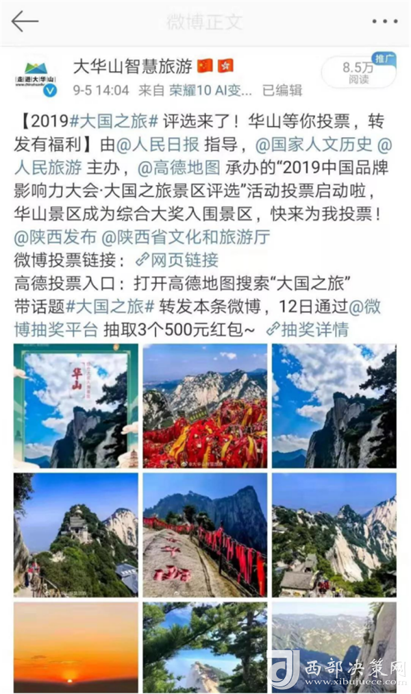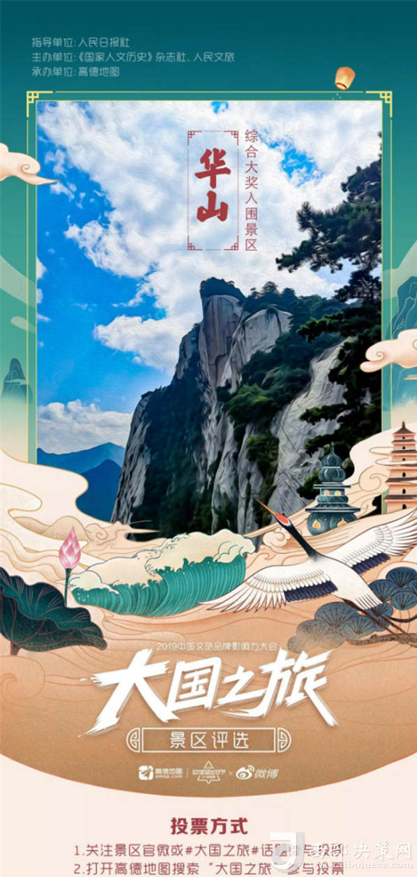 2019大國(guó)之旅景區(qū)評(píng)選活動(dòng)由人民日?qǐng)?bào)社指導(dǎo),《國(guó)家歷史人文》雜志社、人民旅游主辦,高德地圖承辦,于9月2日正式啟動(dòng)。此次活動(dòng)采取大眾投票+高德地圖旅游大數(shù)據(jù)+專(zhuān)家及媒體評(píng)審相結(jié)合的形式,得出最終獲獎(jiǎng)名單。游客通過(guò)新浪微博關(guān)注景區(qū)官博“ 大華山智慧旅游”為華山景區(qū)投票,智旅公司協(xié)助高德地圖完善了華山景區(qū)地圖板塊的校準(zhǔn)和更新,此次活動(dòng)的開(kāi)展,華山景區(qū)的品牌影響力和知名度也再次得到提升。