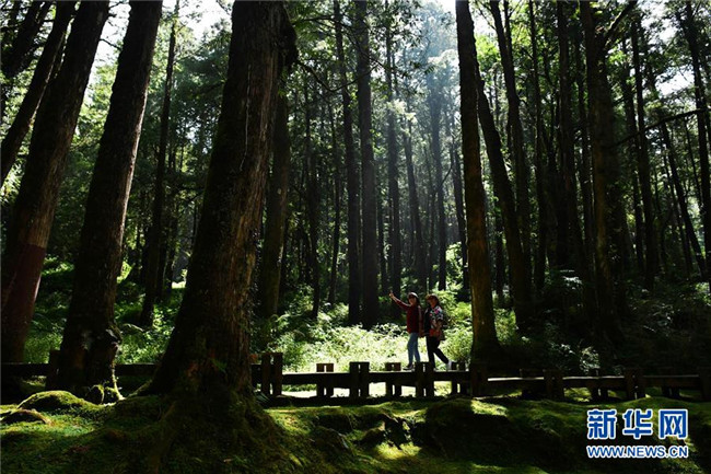10月7日,游客在阿里山的樹林中游覽。