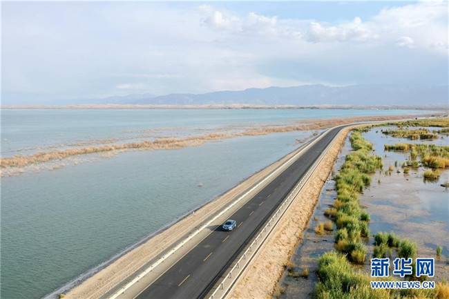 這是新疆博斯騰湖河堤公路(10月12日無人機拍攝)。入秋以來,新疆博斯騰湖碧波蕩漾,美景如畫,吸引各地游客前來游玩。新華社記者丁磊攝