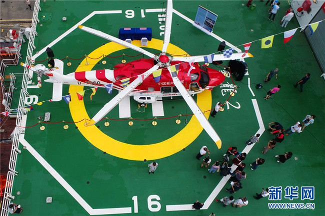 10月14日,“雪龍2”號(hào)向深圳市民開(kāi)放。這是市民在參觀(guān)“雪龍2”號(hào)新配備的“雪鷹301”直升機(jī)(無(wú)人機(jī)拍攝)。新華社記者 劉詩(shī)平 攝