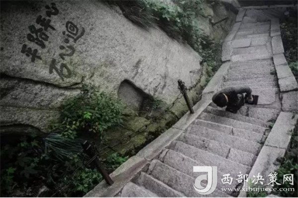 第一道險(xiǎn)關(guān)千尺幢,這是一條峭壁上的大裂縫,陷在兩旁的巨石之間,共370余級(jí)臺(tái)階坡度極陡,每級(jí)臺(tái)階的寬度不過(guò)三分之一的腳掌,幸好兩旁都有可助攀爬的鐵鏈。(在90年代前是沒(méi)有臺(tái)階的,是山上的道士手工琢制的剛剛能放下腳的"腳窩子",一直到"井口",兩旁有可助攀爬的鐵鏈,攀爬的難度比現(xiàn)在的臺(tái)階難度大得多)仰望天際,一線天開(kāi)。俯視腳下,如臨深淵。石級(jí)頂端有如井口,倘若把"井口"用鐵蓋蓋住,通往華山的道路便被堵塞,所以稱之為"太華咽喉"。