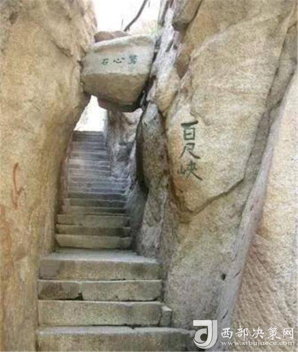 出千尺幢不遠(yuǎn)是百尺峽,這里是登山第二道險(xiǎn)關(guān)。雖沒(méi)有千尺幢那么長(zhǎng),僅46米,石階91級(jí),但仍是華山天險(xiǎn)之一。這里勢(shì)危坡陡,石壁峭立,通道狹窄,且有懸石,搖搖欲墜。游人至此都心驚膽顫。明顧端木有詩(shī)狀其險(xiǎn)曰:"幢去峽復(fù)來(lái),天險(xiǎn)不可瞬。雖云百尺峽,一尺一千仞。"千尺幢、百尺峽的臺(tái)階都是從明末清初開(kāi)始鑿的,民國(guó)時(shí)幾經(jīng)加固,解放后又多次修整,一九八五年又鑿復(fù)道,游人上下各行其道。
