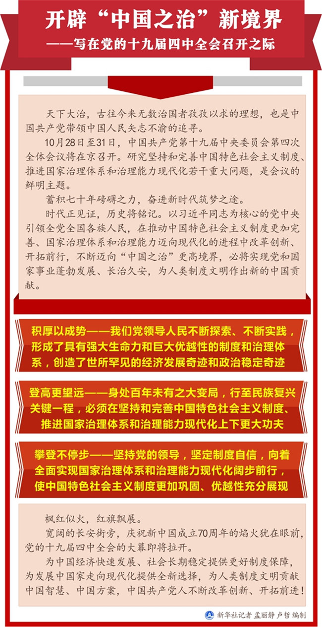10月28日至31日,中國(guó)共產(chǎn)黨第十九屆中央委員會(huì)第四次全體會(huì)議將在京召開。研究堅(jiān)持和完善中國(guó)特色社會(huì)主義制度、推進(jìn)國(guó)家治理體系和治理能力現(xiàn)代化若干重大問題,是會(huì)議的鮮明主題。