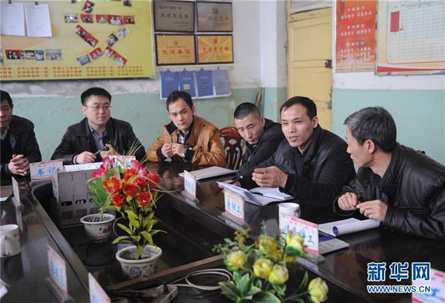 全國(guó)人大代表、山西焦煤西山煤電杜兒坪煤礦的董林(右二)在和工友們座談(2013年2月26日攝)。新華社記者 燕雁 攝