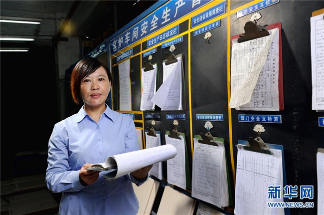 首批農(nóng)民工全國(guó)人大代表之一胡小燕在曾經(jīng)工作過的陶瓷廠檢查職工權(quán)益保護(hù)工作(2013年11月5日攝)。新華社記者 劉大偉 攝