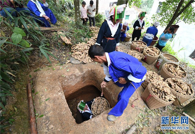 11月12日,廣西賀州市平桂區(qū)鵝塘鎮(zhèn)槽碓村和土瑤群眾將剛剛收獲的大肉姜放入地窖儲存。