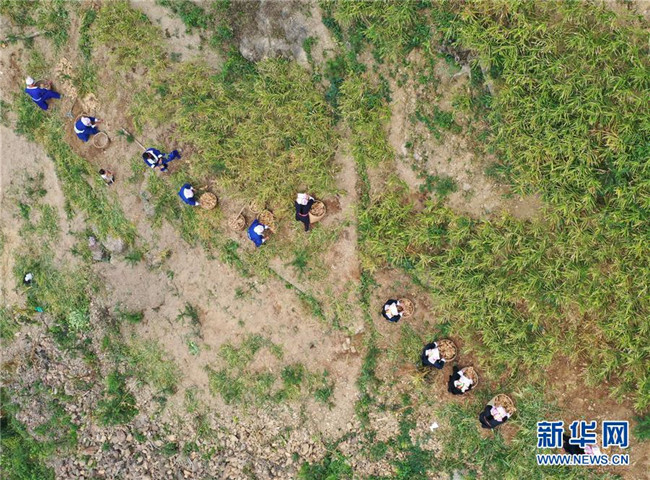 11月12日,廣西賀州市平桂區(qū)鵝塘鎮(zhèn)槽碓村的土瑤群眾在收獲大肉姜(無人機(jī)拍攝)。