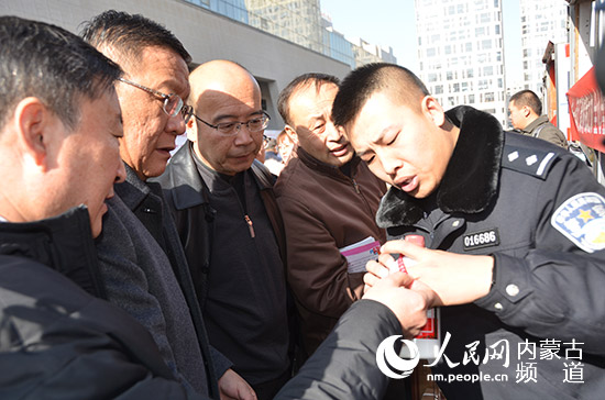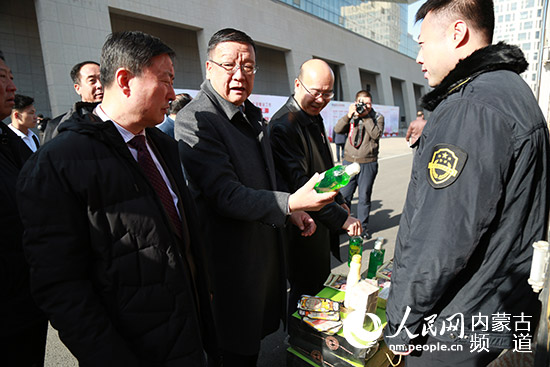 內(nèi)蒙古市場監(jiān)督管理局局長白清元查看現(xiàn)場展示的假冒偽劣商品。