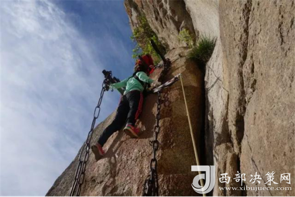 長空棧道:“長空棧道”可謂華山險(xiǎn)道之首,它尤如一道奇異的仙練鑲嵌在南峰絕壁。明代“后七子”之一的李攀龍《太華山記》載:“出南天門向西就是棧道,棧雖有銅柱鐵索攔護(hù),然闊不盈尺。行二十余丈方至盡頭。下折為井,高約三丈,旁出復(fù)為棧……”置身其中,直覺背空腳虛,發(fā)豎氣閉,寒風(fēng)沖襠,骨松筋緊,膽大者有凌空欲飛之感,膽弱者心生抵近鬼門之憂。多少年來“長空棧道”以它特有的絕險(xiǎn)情懷召喚著天下英雄豪杰一試身手,體驗(yàn)驚心動(dòng)魄,揮灑豪邁人生。