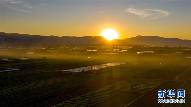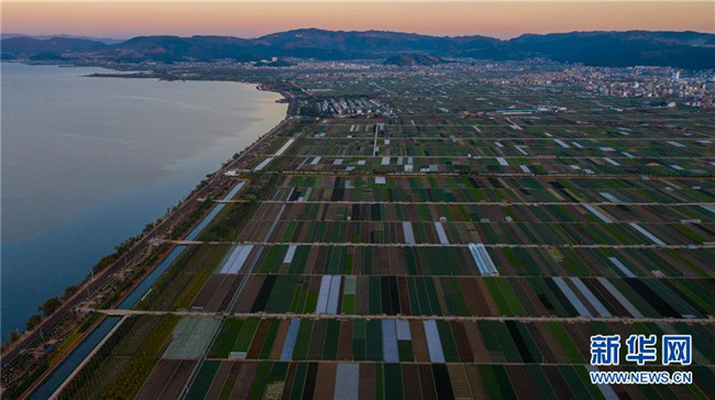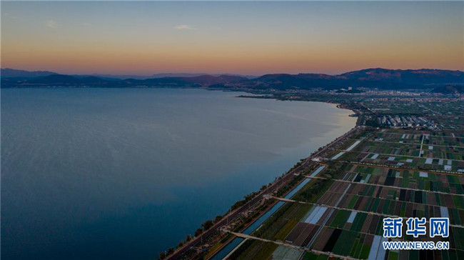 這是云南省玉溪市通??h的田園風(fēng)光(11月23日無人機拍攝)。初冬時節(jié),云南省玉溪市通海縣風(fēng)景秀麗,山巒、湖水與農(nóng)田組成了一幅美麗的田園詩畫卷。新華社記者胡超攝