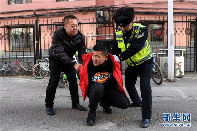 11月25日,在防暴演練現(xiàn)場,民警和家長合作制服一名“歹徒”。