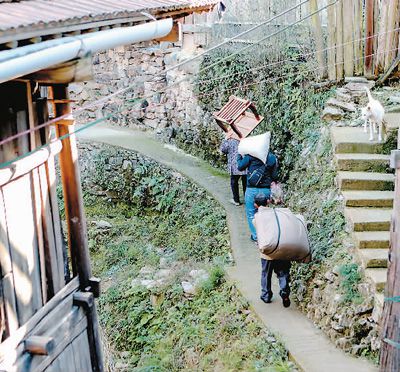 楊昌儒一家背著行李走在搬家的路上。