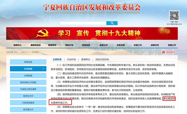 在自治區(qū)發(fā)改委官方網(wǎng)站上,其機構職能中主要職責提到負責牽頭推進優(yōu)化營商環(huán)境工作。(網(wǎng)頁截圖)