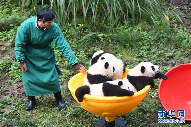 12月22日,飼養(yǎng)員引導大熊貓寶寶到戶外運動。當日,重慶動物園為4只大熊貓寶寶“雙雙”“重重”“喜喜”“慶慶”舉行半歲生日慶?;顒?。4只半歲大熊貓在飼養(yǎng)員的照料下,在熊貓館運動場內(nèi)玩耍、嬉戲,與市民游客一同過冬至。新華社記者唐奕攝