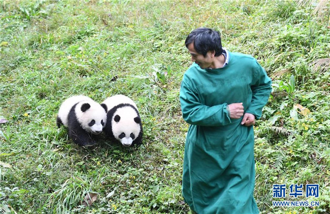 12月22日,飼養(yǎng)員引導兩只半歲大熊貓在戶外運動。當日,重慶動物園為4只大熊貓寶寶“雙雙”“重重”“喜喜”“慶慶”舉行半歲生日慶?;顒?。4只半歲大熊貓在飼養(yǎng)員的照料下,在熊貓館運動場內(nèi)玩耍、嬉戲,與市民游客一同過冬至。新華社記者唐奕攝