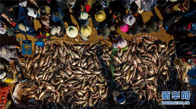 12月25日,人們在星云湖畔的老河咀魚市選購剛捕撈的鮮魚(無人機拍攝)。新華社記者 胡超 攝
