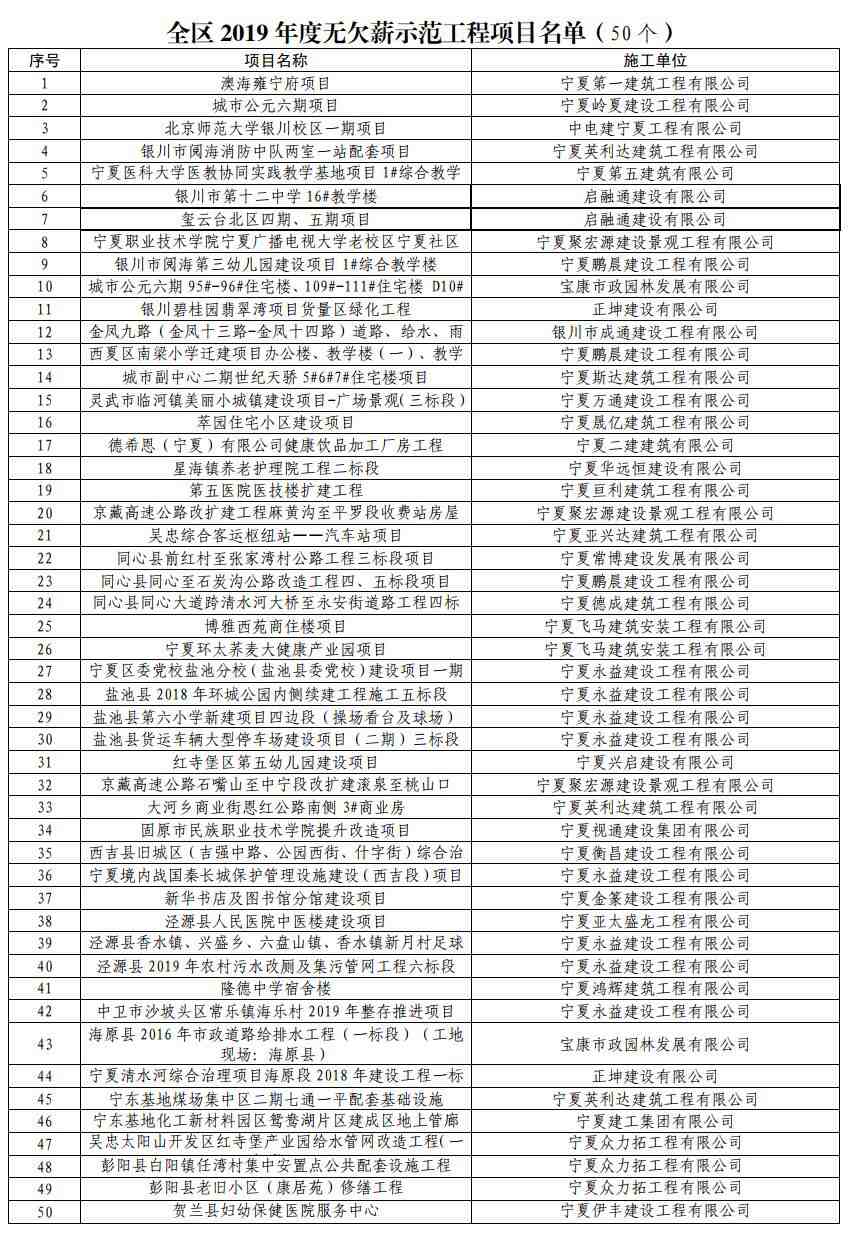1月16日,記者從寧夏人力資源和社會(huì)保障廳獲悉,我區(qū)發(fā)布《關(guān)于2019年度全區(qū)無欠薪示范工程項(xiàng)目的通報(bào)》,對(duì)50個(gè)認(rèn)真履行農(nóng)民工工資支付各項(xiàng)政策的在建工程項(xiàng)目給予表?yè)P(yáng)及企業(yè)誠(chéng)信考核加分。