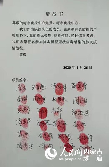 1月26日,1000封按滿紅手印的請(qǐng)戰(zhàn)書“刷屏”了。“在全國上下齊心協(xié)力共同抗擊新型冠狀病毒感染的肺炎疫情之際,請(qǐng)各位主任統(tǒng)計(jì)匯總本科室主動(dòng)申請(qǐng)隨時(shí)去抗疫前線的醫(yī)師,并將自愿報(bào)名的名單發(fā)至本群。”呼和浩特市第一醫(yī)院普外科主任醫(yī)師烏云塔娜把“請(qǐng)戰(zhàn)”信息發(fā)到微信群后,手機(jī)就一直響個(gè)不停。不到一天,呼和浩特市第一醫(yī)院主動(dòng)“請(qǐng)戰(zhàn)”的醫(yī)護(hù)人員就達(dá)到200多人。