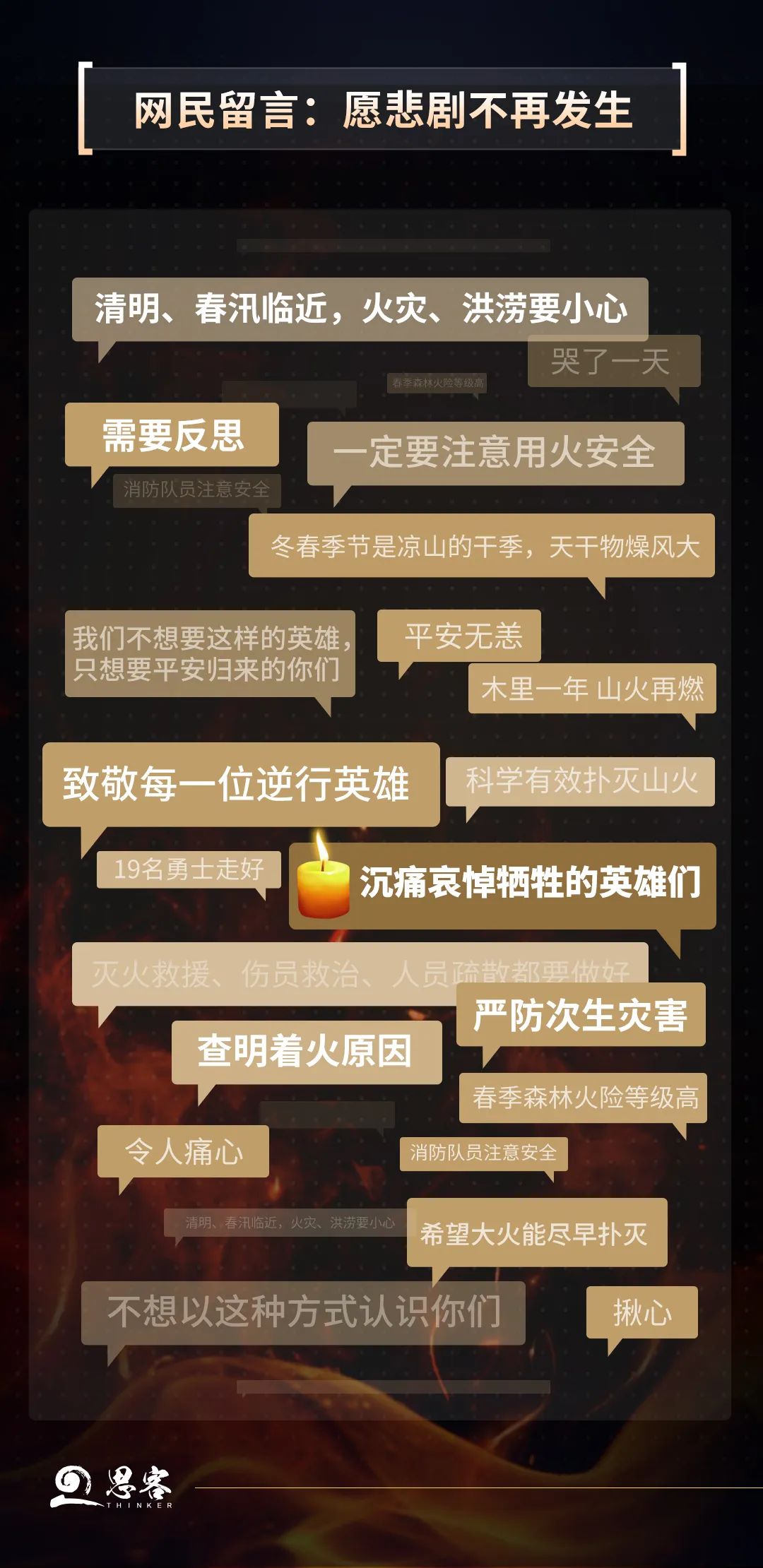 “火災(zāi)”“英雄”“反思”是網(wǎng)民留言中的高頻詞,“我們不想要這樣的英雄,只想要平安歸來的你們”成為網(wǎng)民共同心聲。逆火而行的英雄值得尊敬,但確保撲火人員安全更是前提。有網(wǎng)民說,一年前,四川木里的那場大火,造成31人不幸犧牲;一年后,又是一場大火,再次奪走19條鮮活的生命。春天天干物燥、山火肆虐蔓延、風向突然變化,兩次火災(zāi)場景何其相似。我們需要認真反思,加大對風向突變的預(yù)判,利用更多科技手段滅火,避免火災(zāi)“風”險悲劇重演。