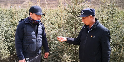 林業(yè)人員在高原千畝林木良種繁育實(shí)驗(yàn)基地查看樹(shù)苗情況。 楊陽(yáng)攝