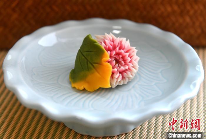半個小時后,一個精致的菊花造型和果子呈現(xiàn)在眼前。不及巴掌大的和果子令人食指大動,既想仔細(xì)觀賞,又想品嘗一下它的味道。