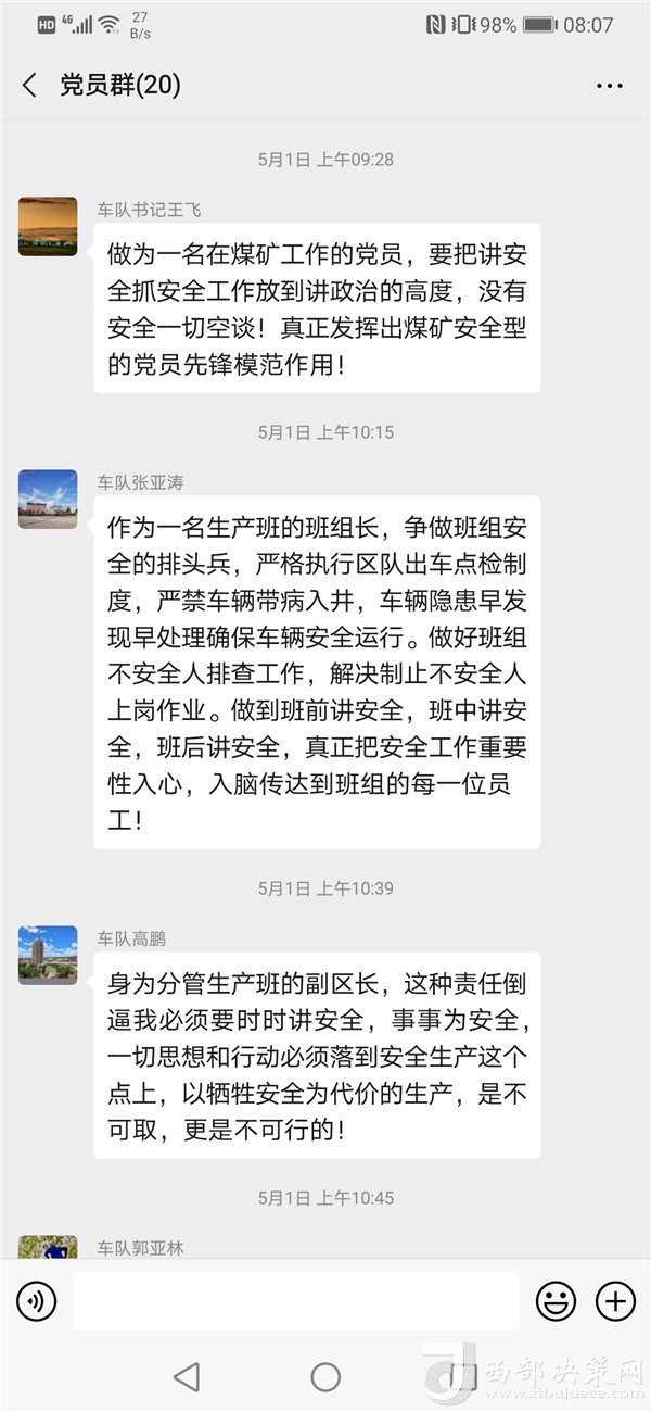 西部決策網(wǎng)訊(記者王瑞鵬 通訊員 張亞濤)為更好地發(fā)揮基層黨支部戰(zhàn)斗堡壘作用、廣大黨員先鋒模范作用,5月份,陜北礦業(yè)檸條塔公司膠輪車運輸工區(qū)開展“講安全、抓安全”主題黨日活動。該支部按照“全員學(xué)習(xí)、座談討論、結(jié)合崗位實際”的學(xué)習(xí)方式,全面深入開展“吸取教訓(xùn)、查擺問題、整改落實、確保安全”主題黨日活動。