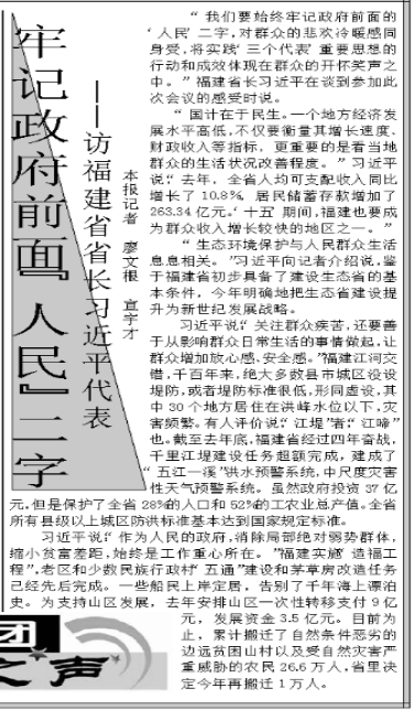 “我們要始終牢記政府前面的‘人民’二字,對群眾的悲歡冷暖感同身受。”2002年3月4日,人民日報兩會特刊的“代表團之聲”欄目里,刊發(fā)了對時任福建省省長的習(xí)近平代表的采訪,標題是《牢記政府前面“人民”二字》。