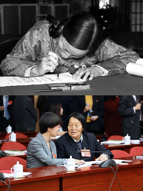 申紀(jì)蘭用她半生時(shí)間見證了中國民主法制建設(shè)的進(jìn)程。上圖為出席第一屆全國人民代表大會(huì)第一次會(huì)議的人大代表申紀(jì)蘭在報(bào)到(1954年9月攝);下圖為她(右)在十三屆全國人大二次會(huì)議山西代表團(tuán)會(huì)議間隙與青年代表交流(2019年3月攝)。