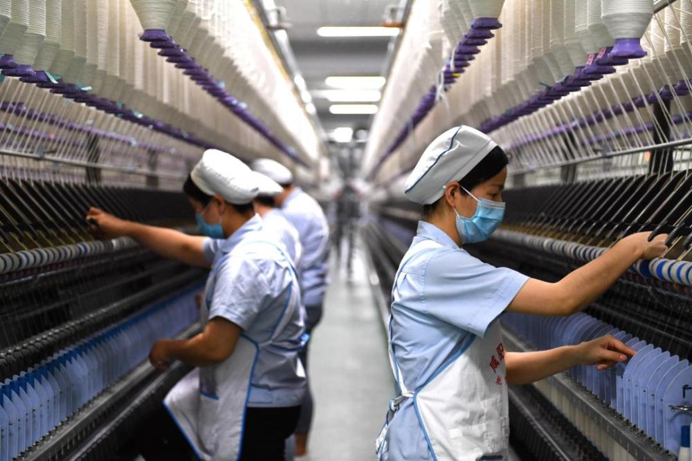在抗擊新冠肺炎疫情過(guò)程中,陜西省咸陽(yáng)紡織集團(tuán)有限公司一分廠紡織工人堅(jiān)守在復(fù)工復(fù)產(chǎn)一線,搶抓工時(shí)完成生產(chǎn)任務(wù)。(新華社記者張博文 攝)