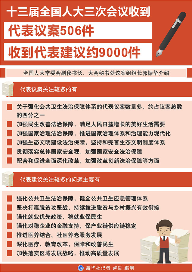記者26日從十三屆全國人大三次會(huì)議秘書處獲悉,到大會(huì)主席團(tuán)決定的代表提出議案截止時(shí)間5月25日12時(shí),大會(huì)秘書處共收到代表提出的議案506件。同時(shí),收到代表建議約9000件。
