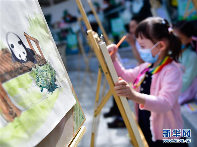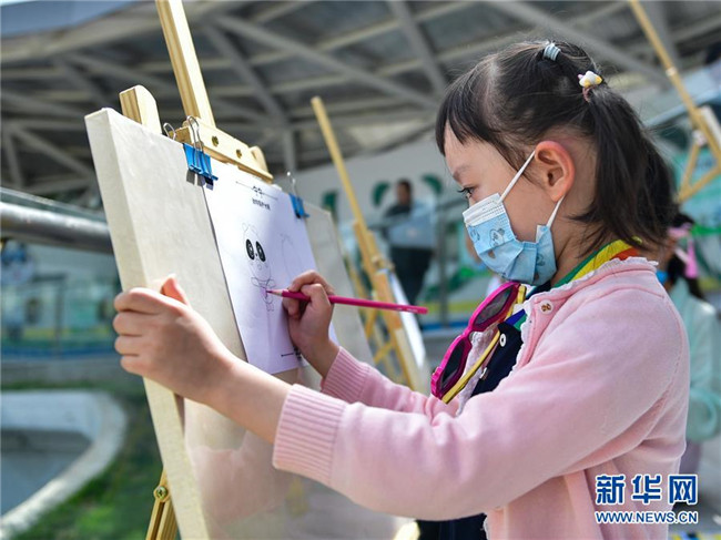 5月31日,小朋友在西寧熊貓館內(nèi)繪畫(huà)。 新華社記者 張龍 攝