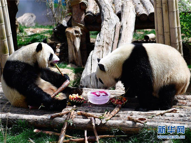 5月31日,兩只大熊貓?jiān)谙碛脙和?jié)“大餐”。 新華社記者 張龍 攝