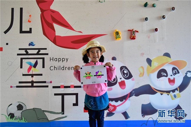 5月31日,一位小朋友在西寧熊貓館內(nèi)展示自己的熊貓主題畫(huà)作。 新華社記者 張龍 攝