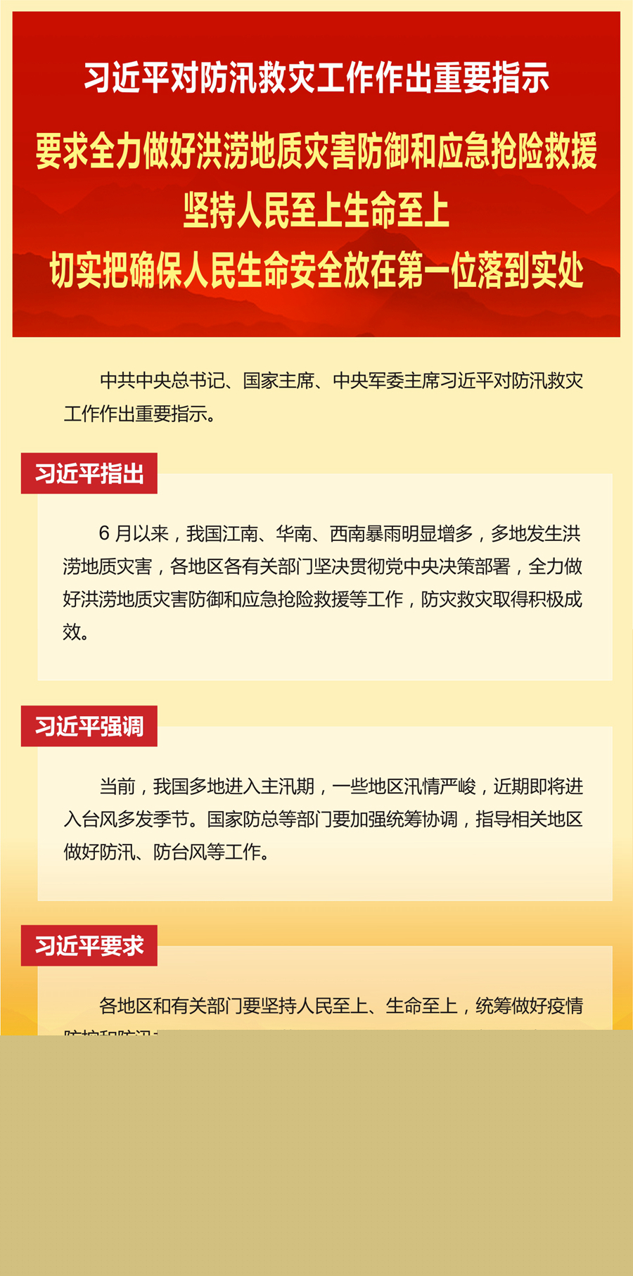 中共中央總書記、國家主席、中央軍委主席習(xí)近平對防汛救災(zāi)工作作出重要指示。