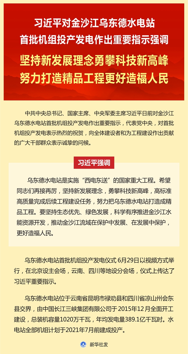 原標(biāo)題:習(xí)近平對(duì)金沙江烏東德水電站首批機(jī)組投產(chǎn)發(fā)電作出重要指示強(qiáng)調(diào) 堅(jiān)持新發(fā)展理念勇攀科技新高峰 努力打造精品工程更好造福人民