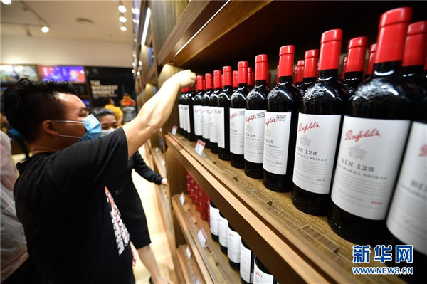 7月1日,??谌赵聫V場免稅店的工作人員為顧客打包酒類商品。當日,海南開始實施調(diào)整后的離島免稅購物政策。海南離島旅客每年每人免稅購物額度提高至10萬元,電子消費產(chǎn)品等7類新增商品開售。新華社記者郭程攝