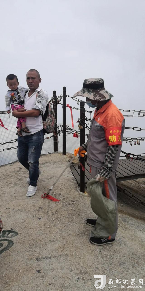 楊群社是景區(qū)一名環(huán)衛(wèi)工,負責華山西峰頂區(qū)域的衛(wèi)生保潔工作。為了給游客創(chuàng)造一個干凈整潔的游覽環(huán)境,熾熱的陽光下,楊群社在自己的區(qū)域內(nèi)不停地來回撿拾垃圾。