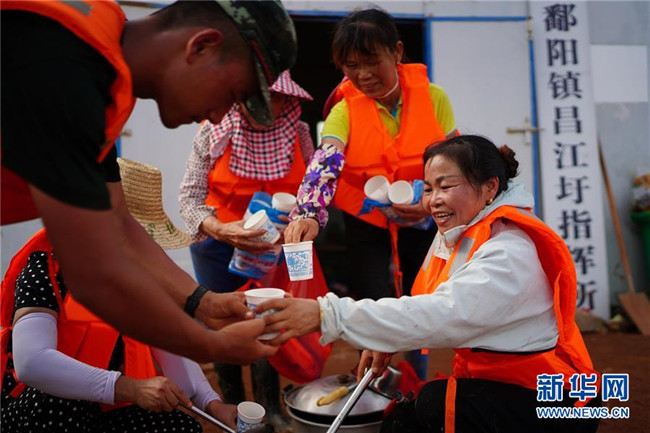 7月11日,在江西省鄱陽(yáng)縣鄱陽(yáng)鎮(zhèn)江家?guī)X村,“阿姨團(tuán)”隊(duì)長(zhǎng)余風(fēng)英(右一)給武警戰(zhàn)士盛綠豆湯。 新華社記者 周密 攝