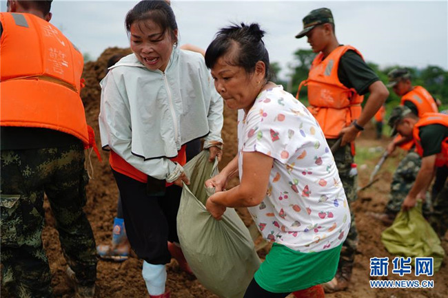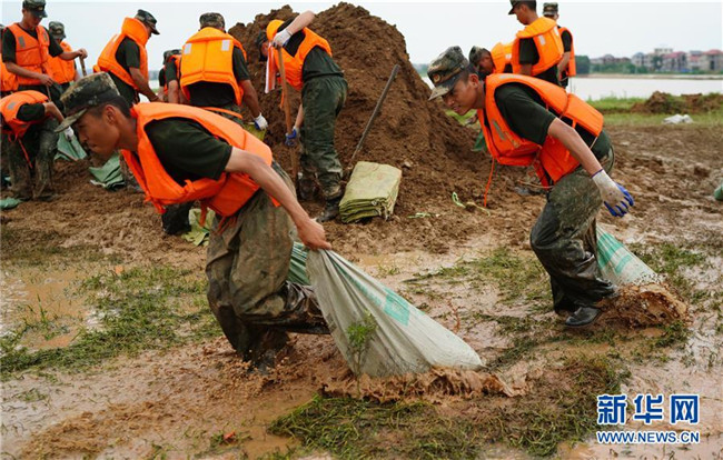 7月11日,武警戰(zhàn)士在江西省鄱陽(yáng)縣鄱陽(yáng)鎮(zhèn)江家?guī)X村搬運(yùn)沙袋。 新華社記者 周密 攝