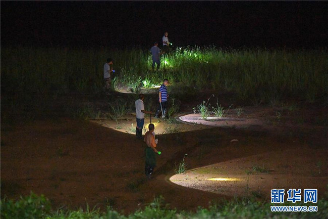 7月11日,位于湖南省岳陽(yáng)市君山區(qū)的洞庭湖大堤上,工作人員和群眾在夜晚巡堤查險(xiǎn)。 新華社記者 陳澤國(guó) 攝