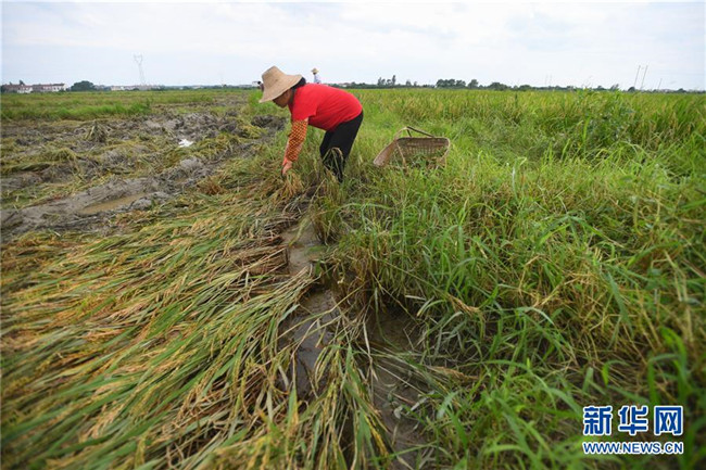 7月11日,村民在湖南省岳陽(yáng)市岳陽(yáng)縣筻口鎮(zhèn)一處農(nóng)田里收割倒伏的早稻。 新華社記者 陳澤國(guó) 攝