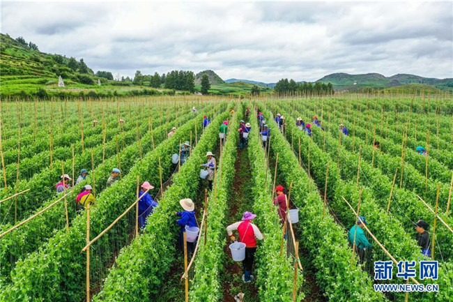 7月14日,村民在貴州省畢節(jié)市威寧縣草海鎮(zhèn)中海村的蔬菜基地里勞作。新華社發(fā)(羅大富 攝)