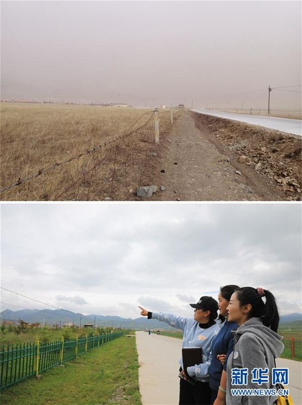 拼版照片:上圖為崗岔村村道綠化改造前的面貌(資料照片)。下圖為7月23日,卓瑪吉(右一)和駐村幫扶工作隊(duì)隊(duì)員站在綠化改造后的崗岔村村道上,謀劃下一步的工作。新華社發(fā)(杜哲宇攝)崗岔村是甘肅省甘南藏族自治州夏河縣桑科鎮(zhèn)的一個(gè)牧業(yè)村,平均海拔3000米以上。2018年,在夏河縣文明辦工作的卓瑪吉開(kāi)始擔(dān)任駐村幫扶工作隊(duì)隊(duì)長(zhǎng),每年都有200多天待在草原上。兩年來(lái),卓瑪吉帶領(lǐng)大家開(kāi)辦扶貧車(chē)間,發(fā)展特色產(chǎn)業(yè),聯(lián)系勞務(wù)輸出。為了讓村民更全面地了解精準(zhǔn)扶貧政策,卓瑪吉登門(mén)宣講政策。為了提高村容村貌,卓瑪吉發(fā)動(dòng)大家開(kāi)展廁所革命和庭院環(huán)境評(píng)比,積極響應(yīng)甘南藏族自治州“全域無(wú)垃圾”創(chuàng)建行動(dòng)。她還從縣城請(qǐng)來(lái)醫(yī)生,為村民舉辦健康講座,在全村婦女中開(kāi)展“兩癌篩查”。如今,崗岔村變成了干凈、整齊、富裕、美麗的生態(tài)文明村,提前實(shí)現(xiàn)了整村脫貧。談起心愿,卓瑪吉說(shuō):“要讓草原和草原上的人都變得更美。”新華社發(fā)