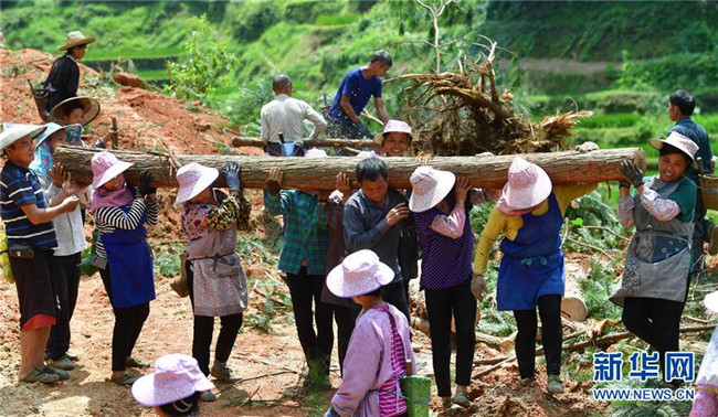 在烏英苗寨,村民們在山上扛木頭,為產(chǎn)業(yè)路施工做準備(7月30日攝)。 新華社記者 黃孝邦 攝