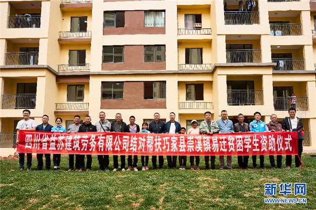 經(jīng)過(guò)中建二局志愿者的牽線搭橋,四川一勞務(wù)公司老板涂永林決定資助李本艷姐弟倆到大學(xué)畢業(yè)。在李本艷的新家樓下,雙方舉行了簡(jiǎn)單的資助儀式(攝于4月3日)。新華網(wǎng)發(fā)(鮑禹 攝)
